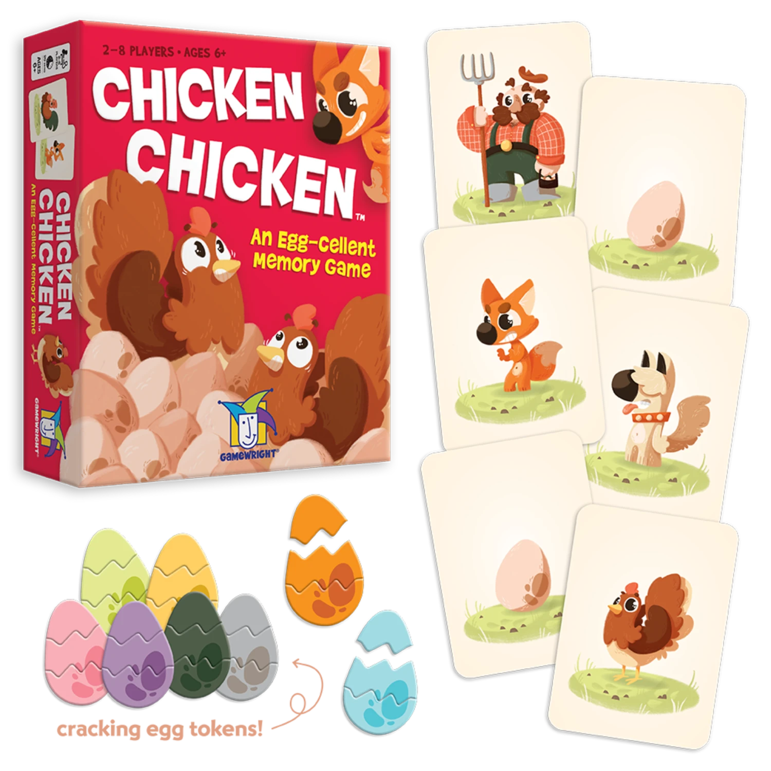 Count your chickens before they hatch! Reveal cards one at a time, keeping a mental tally of the eggs. Be the first to slap the pile when you think the total equals five. But watch out! Chickens, foxes, dogs, and others get mixed in to fowl up your count. The more characters you add, the more eggciting the game! Win three rounds and you rule the roost!