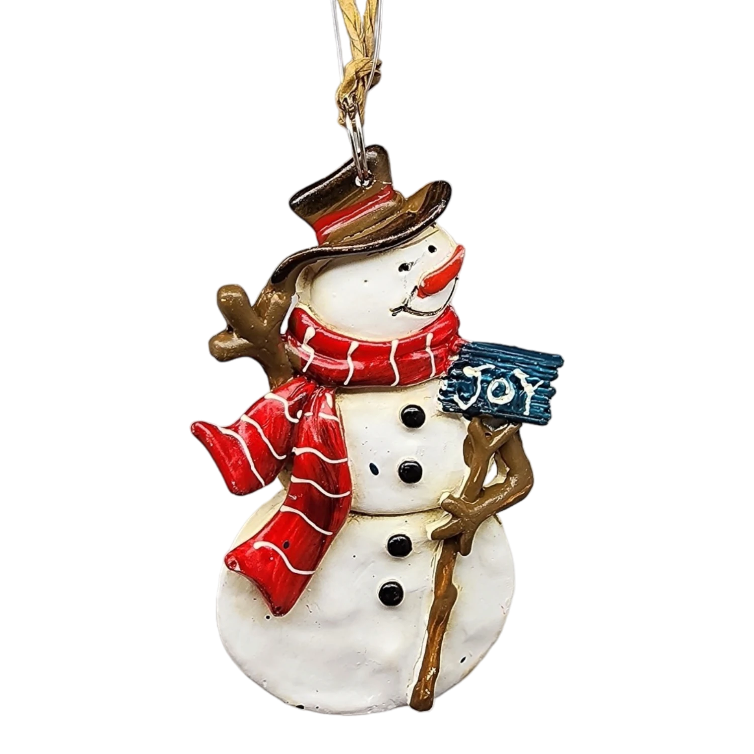 Spread holiday cheer with this enchanting Snowman ornament, crafted from durable polyresin and standing 3 inches tall. This flat ornament features a jolly snowman dressed in a festive hat and scarf, holding a sign that reads “JOY.” The snowman’s cheerful expression and intricate details, including its carrot nose, button eyes, and stick arms, capture the essence of holiday happiness and warmth.