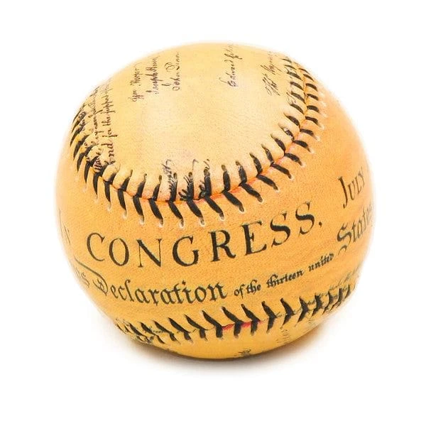 This regulation-sized collectible baseball is embossed with the opening lines of the United States Declaration of Independence on one side and the signatures of the signers on the other.