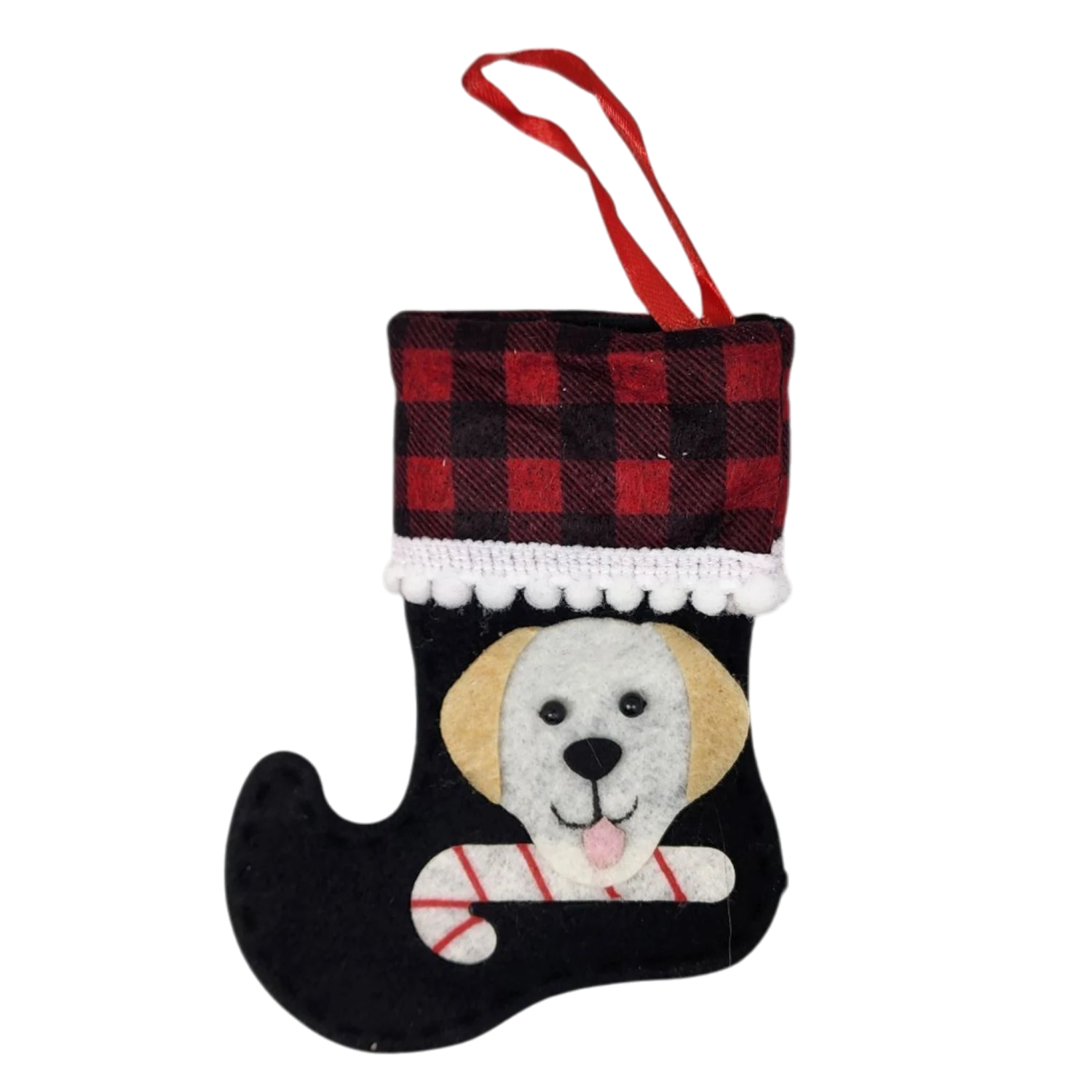 Celebrate the holiday spirit with our delightful Labrador mini stocking ornament! Standing at 6 inches tall, this charming felt stocking features the adorable face of a Labrador, complete with a friendly smile that captures the essence of this beloved breed. Adorned with a classic black material and topped with a festive red and black plaid cuff, along with playful white pom-pom trim, this ornament adds a warm and inviting touch to your Christmas decor.