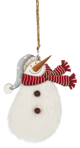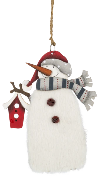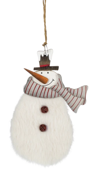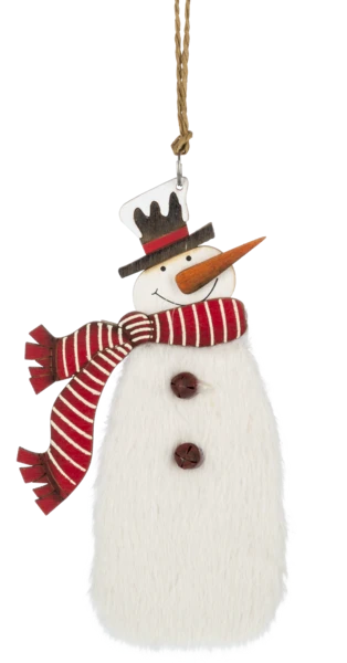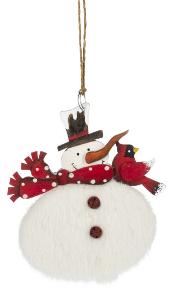 Adorable wooden snowman ornament with a Fuzzy fabric belly. Handpainted wooden head and scarf with real Bells on his Belly.