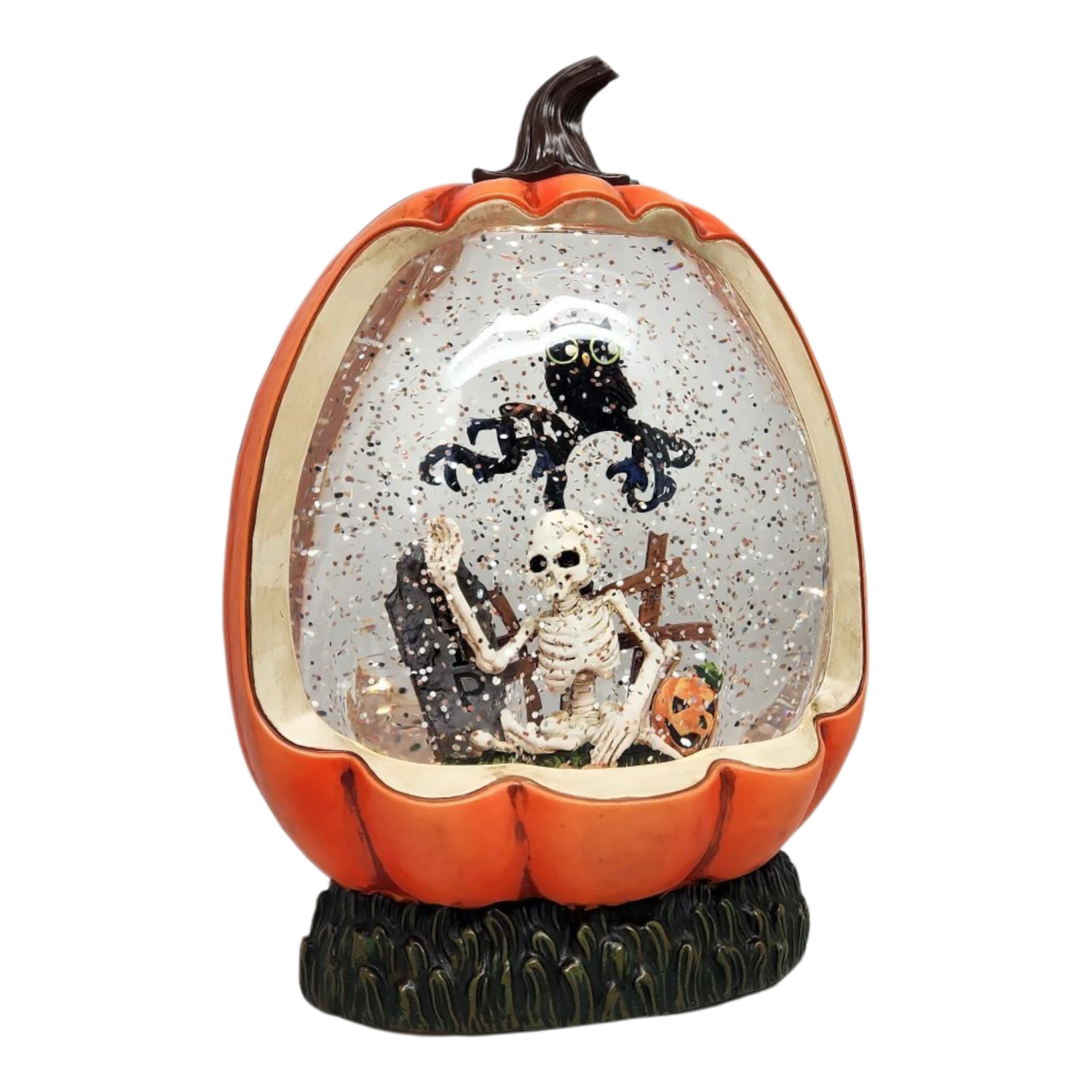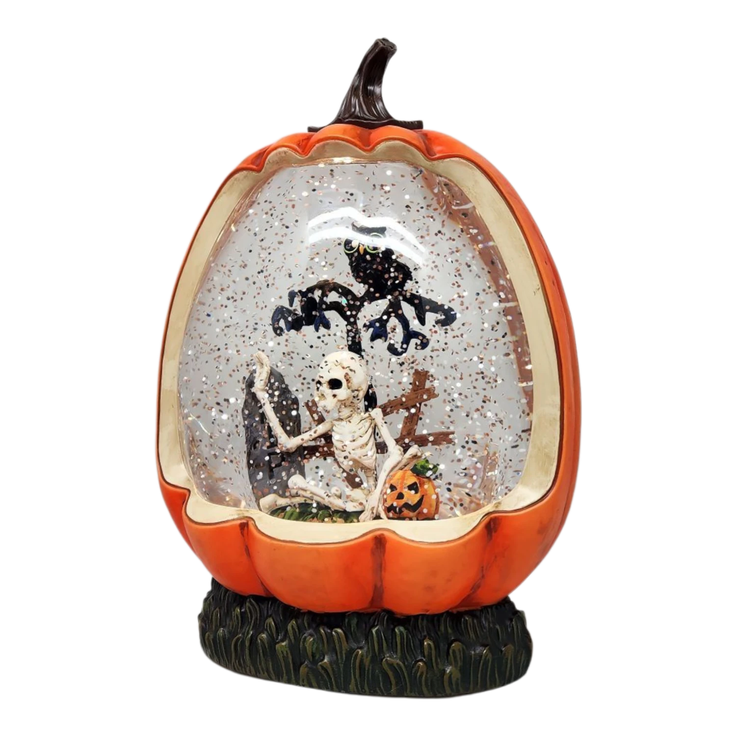Ideal for adornment on tabletops, mantels, or as a centerpiece during Halloween gatherings, the Spooky Skeleton Pumpkin Water Globe is sure to capture the attention and hearts of everyone. With its playful design and enchanting shimmer, it invites joy and conversation into your festive celebrations, making it a beloved piece to display for years to come!