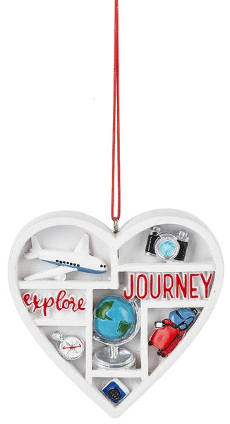 The perfect ornament for the traveler in your life. This heart ornament is accented with travel icons like planes, compasses, and luggage.