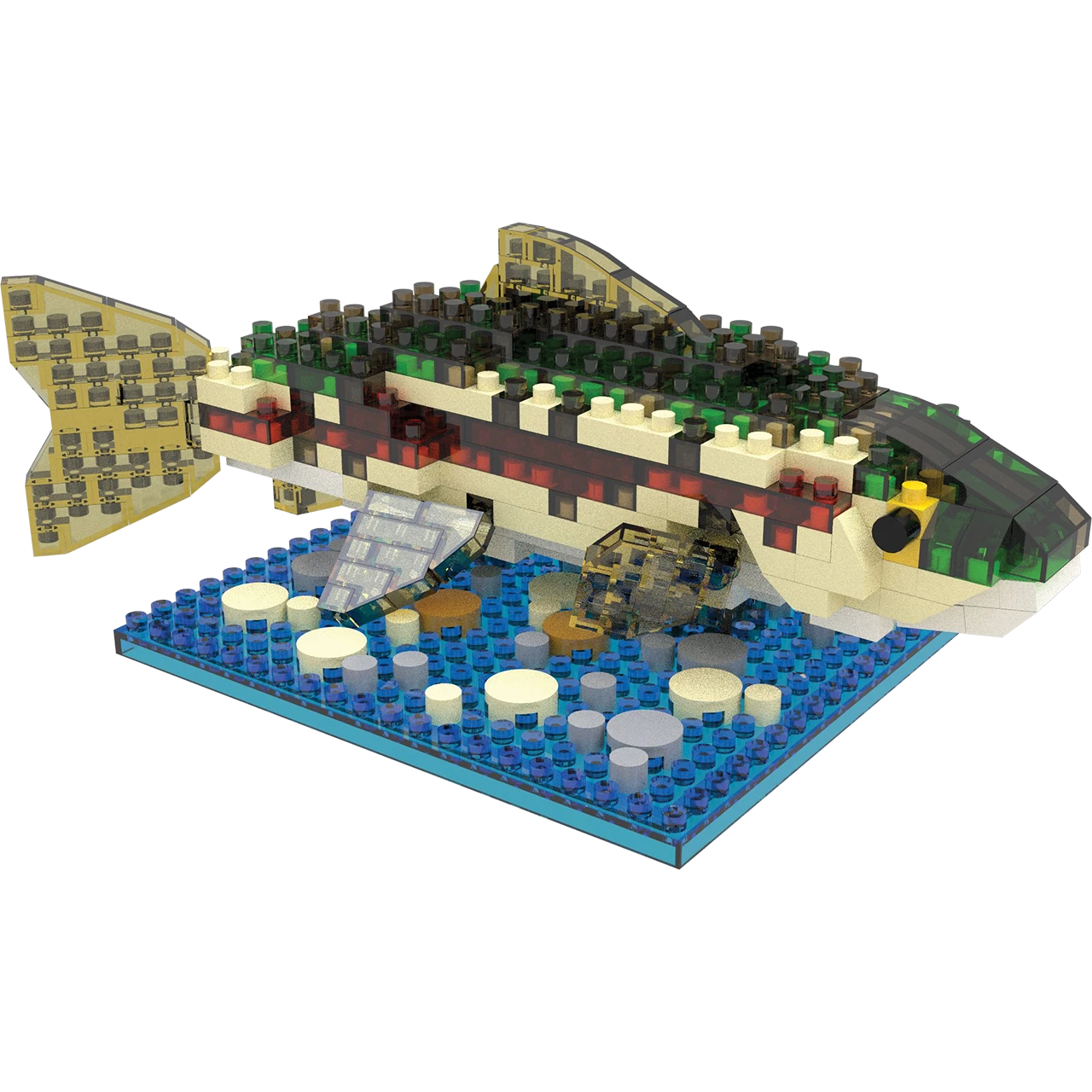 Constructing this stunning rainbow trout is both fun and educational, enhancing fine motor skills while sparking creativity. Each piece fits together seamlessly to form the trout’s iridescent scales, colorful patterns, and slender body, resulting in a lifelike and captivating model. The set includes a detailed blue base adorned with aquatic plants and pebbles, creating a vivid and naturalistic scene for display.