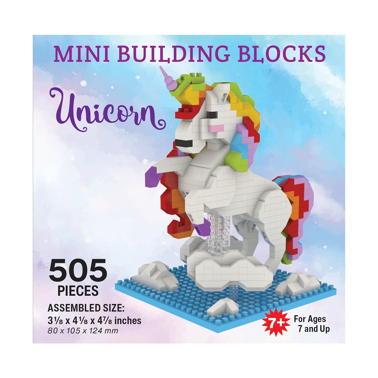 Enter a world of magic and wonder with the Mini Building Blocks Unicorn set! With an enchanting total of 505 pieces, this delightful set is perfect for builders aged 7 and up, offering a captivating assembly experience that brings the mythical unicorn to life. The completed model stands just over 3 inches tall, 4 inches wide, and almost 5 inches deep, proudly posed on a base adorned with whimsical clouds and shimmering elements, capturing the essence of this fantastical creature.