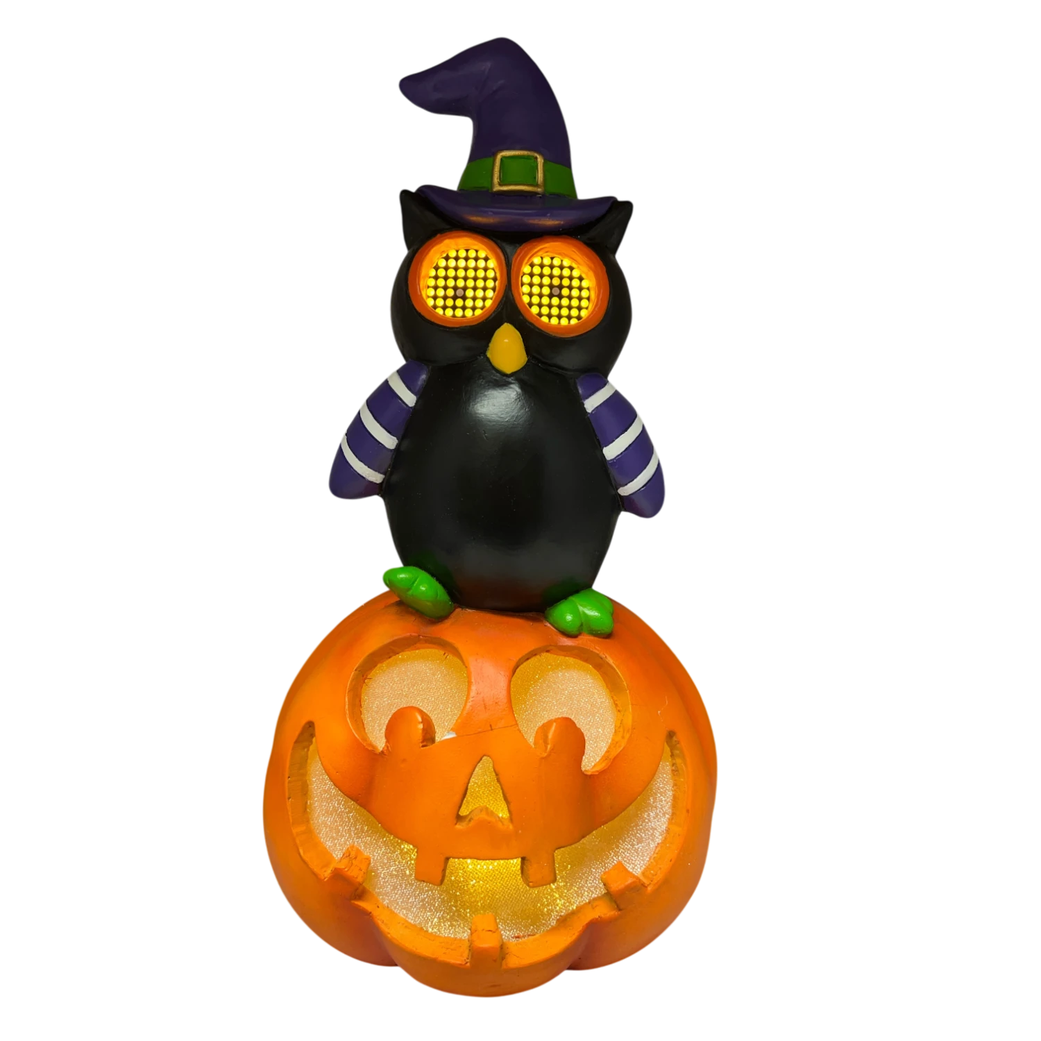 Celebrate the Halloween season with our delightful Animated Halloween Owl on Pumpkin! Standing at an impressive 14 inches tall and measuring 8 inches wide by 5 inches deep, this whimsical decoration features an adorable black owl dressed in a festive witch’s hat. Perched atop a cheerful jack-o’-lantern, this charming figure brings a playful spirit to your Halloween displays.