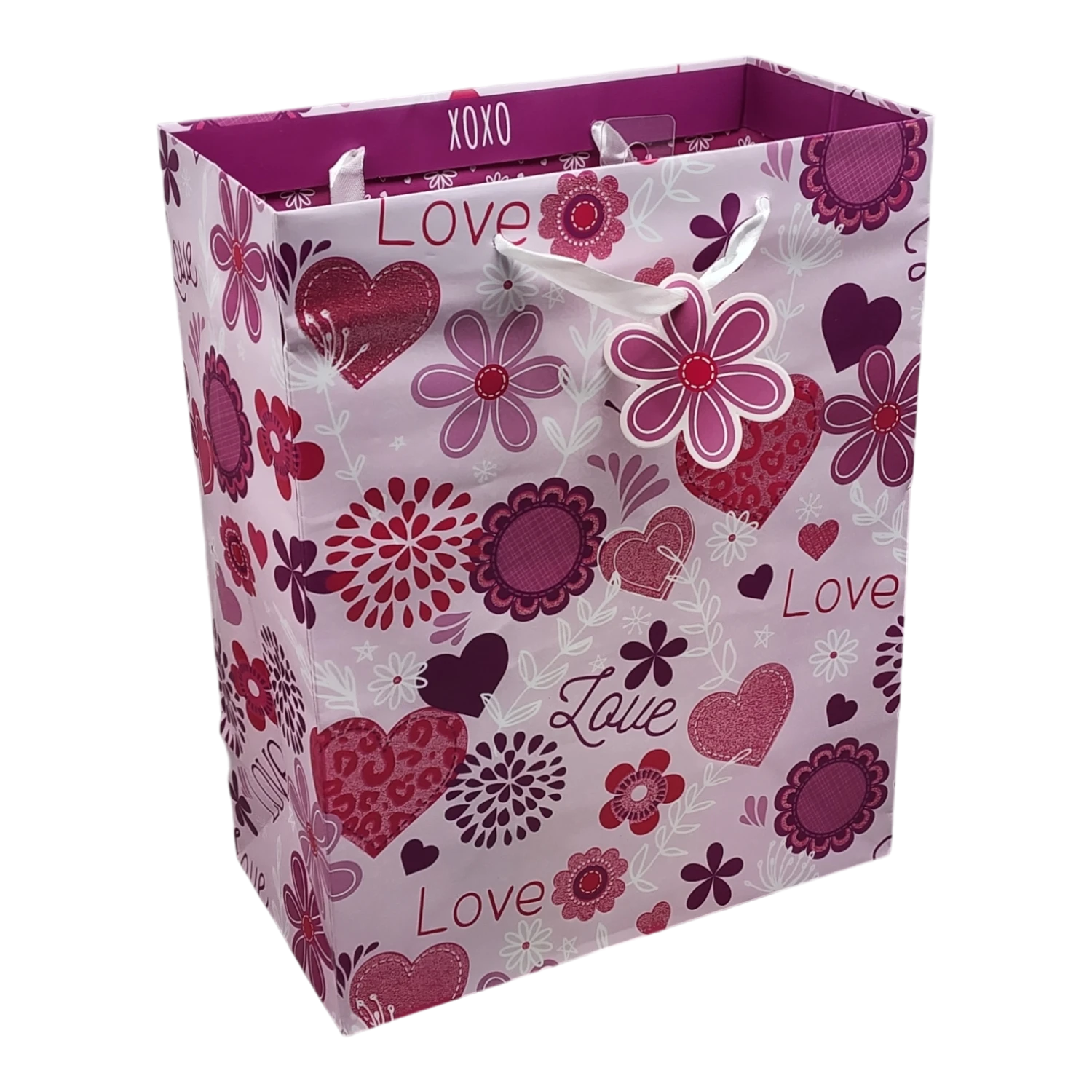 Celebrate love in style with our charming gift bag, perfect for any occasion! Measuring 12.5 inches by 10 inches by 5.25 inches, this delightful bag features a vibrant design with colorful hearts and flowers, accented with the word “Love” in playful fonts. The combination of pink, red, and purple hues creates a cheerful aesthetic that is sure to make any gift feel extra special.
