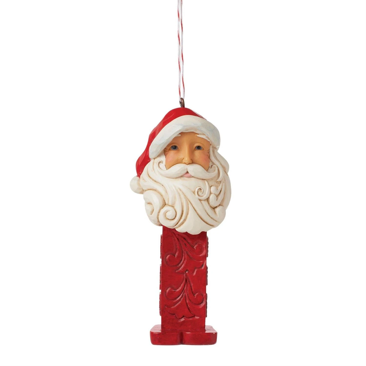 This charming 4-inch tall ornament, designed by Jim Shore, adds a festive touch to your holiday decorations. Shaped like a classic PEZ dispenser, it features an intricately detailed Santa Claus head atop a bright red base adorned with Shore’s signature folk art patterns. Santa’s expressive face, complete with a flowing white beard and traditional red hat, captures the spirit of Christmas with a nostalgic and whimsical twist.