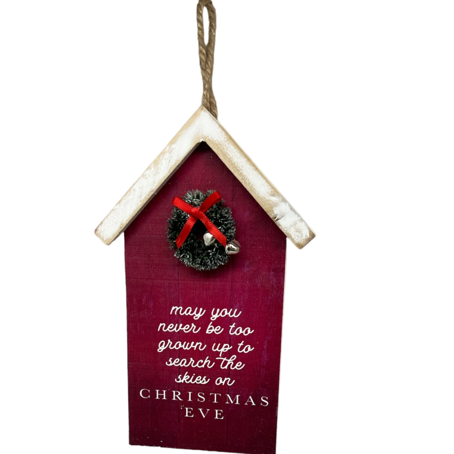 The house features a warm, rich red paint with the heartfelt inscription, “May you never be too grown up to search the skies on Christmas Eve,” beautifully scripted in white. At the center, a small wreath adorned with a red ribbon brings a cozy, festive touch to the design. The roof of the house is dusted with a snowy effect, enhancing its rustic appeal.