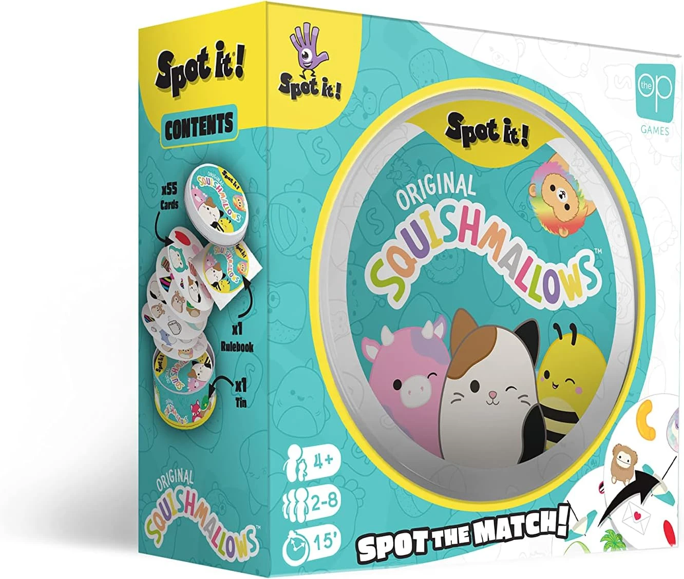 - Includes: 55 Spot It! Squishmallows themed circular cards, tin carrying case, rules